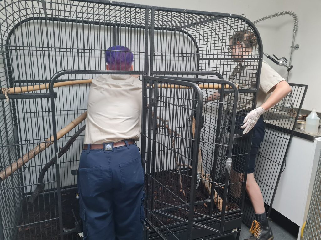 No two days are the same when it comes to cleaning. We could be performing water tests and water changes on our fish tanks, disinfecting and scrubbing down the perches in Rainbow the macaw’s enclosure or even performing a full enclosure substrate change on our giant african land snails or cockroaches. Most animals are very well behaved and stay out of the way when cleaning, some like to “help” with the cleaning process, Haku our Asian water monitor is the best example of this!